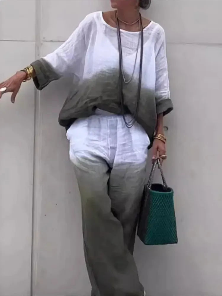 Relaxed Two-Piece Design: Combines a breezy top and wide-leg pants for comfort and style in perfect harmony.