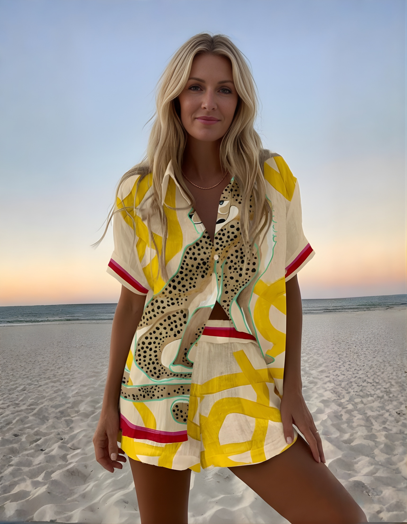 Embrace your adventurous spirit with this short summer ensemble featuring a bold animal print. The striking design and lightweight fabric create a relaxed yet stylish look, making it ideal for both weekend getaways and casual city outings.
